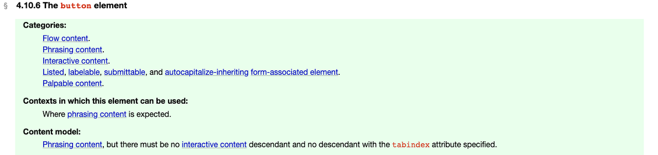 아래는 whatwg에서 제공하는 button 요소에 대한 설명입니다. 사실 여태껏 개발을 하면서 HTML 명세를 살펴본 적은 없습니다. 들어가서 살펴보니 HTML 요소의 맥락적인 정보를(가능한 부모, 자식 요소) 알려주는 것이 새롭습니다.